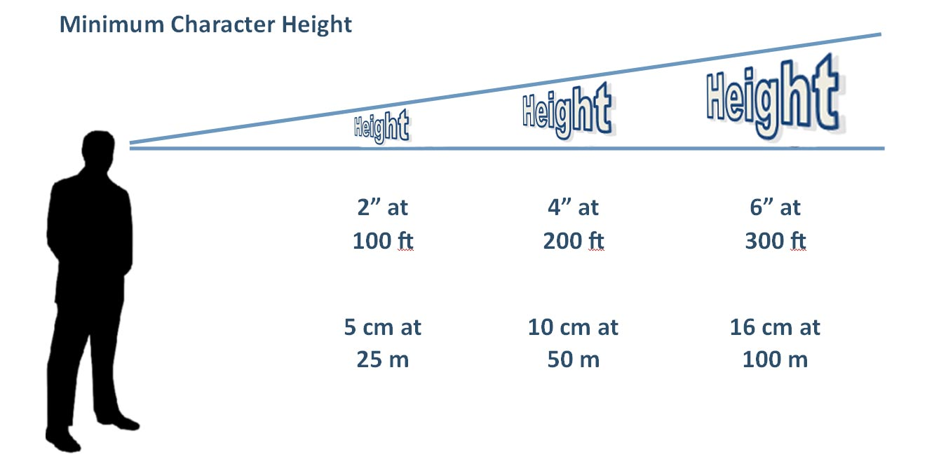 O fator mais importante da sinalização LED é a distância de visualização. Se o seu sinal for visto de longa distância por pessoas no carro dirigindo rápido, você precisará de um tamanho de caractere grande para torná-lo legível. Como regra de tumba, você precisa de pelo menos 2 polegadas de altura do caractere para cada 100 pés de distância de visualização para torná-lo legível. Para sinalização colorida com suporte de imagem e vídeo, você pode precisar de um tamanho maior para causar melhor impacto no visualizador.