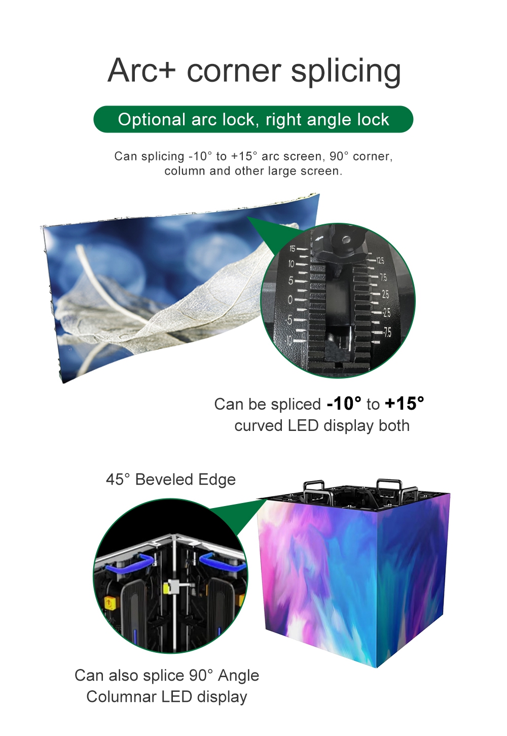* Adaptável a múltiplos cenários: Compatível com gabinetes de 500 x 500 mm e 1000 mm, permitindo instalação mista. A versão curva suporta configurações para telas com arco de -10° a 15°, cantos de 90° e instalações em colunas para displays grandes.