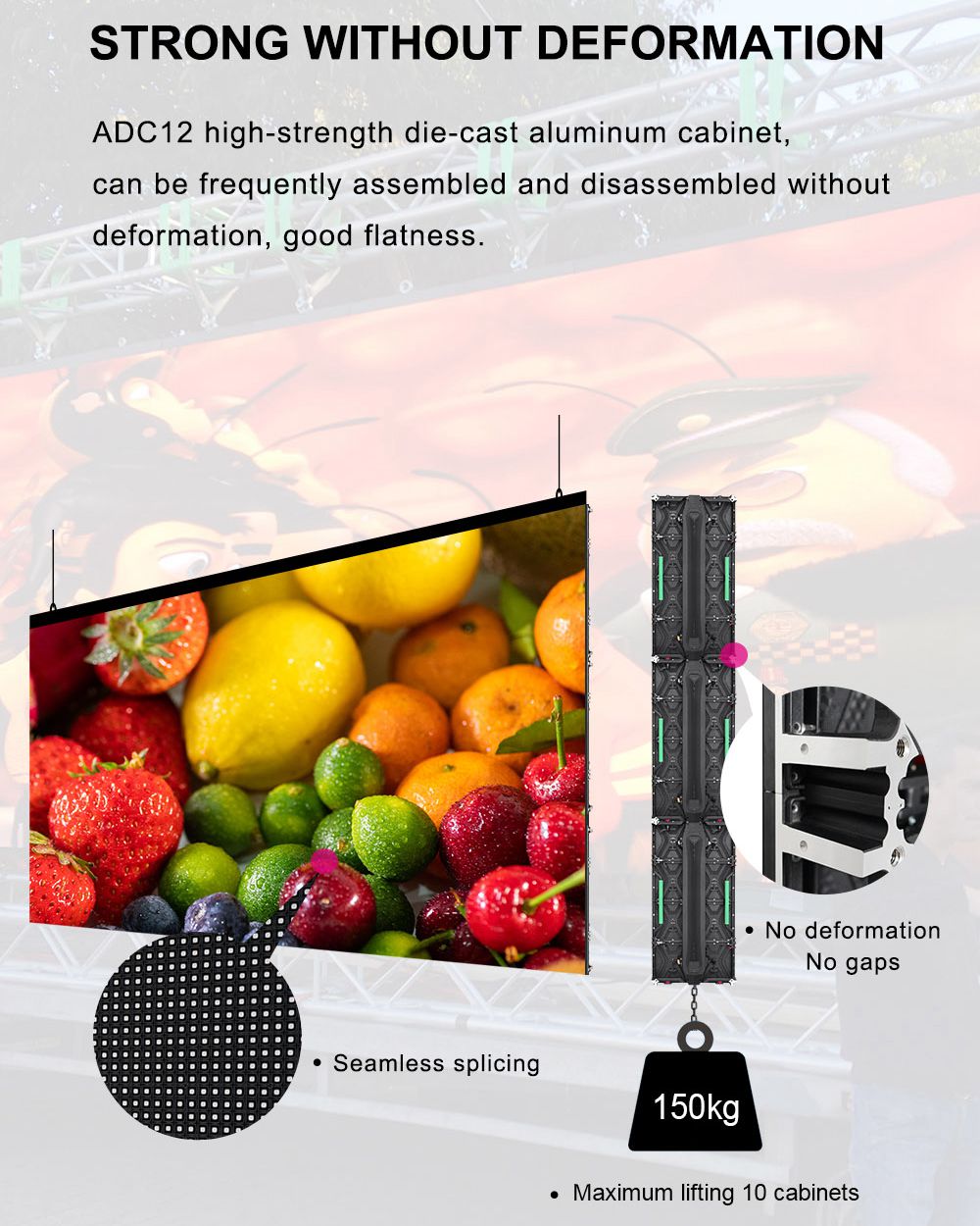 Características: 1 Bom nivelamento: a tela adota gabinetes de alumínio fundido com tolerância de 0,1 mm; 2 Ultrafinos: os gabinetes de alumínio fundido são 20% mais finos e pesam 15kg/㎡ do que os gabinetes de ferro, o que ajuda a reduzir significativamente os custos de transporte e estrutura; 3 Fácil de atualizar e substituir: os gabinetes são adaptados aos nossos módulos P2.5~P16; então você não precisa trocar os gabinetes para uma atualização, isso economizará muita mão de obra e custos de gabinete; 4 Múltiplas finalidades: Como uma solução de display grande, a série C-Fit é amplamente utilizada como telas de publicidade externa, telas para aluguel de palcos e telas LED de perímetro de estádios; a série C-Fit não é usada apenas como telas permanentemente montadas na parede, mas também como telas empilhadas no solo para pequenos eventos ou espaços com tetos baixos; 5 Alto brilho: o brilho atinge 3700 ~ 4200CD/㎡, então a tela ainda pode apresentar imagens nítidas sob luz forte; 6 Aumento lento da temperatura, dissipação de calor eficiente: o dispositivo de dissipação de calor adota material de liga de alumínio e magnésio com excelente condução de calor; 7 Altamente econômico: um gabinete com classificação IP65 oferece proteção contra todos os tipos de condições climáticas adversas, como jatos de água, névoa salina, corrosão salina e erosão eólica; 8 Alta confiabilidade: todos os módulos adotam técnica de vedação e fio de cobre de alta qualidade;