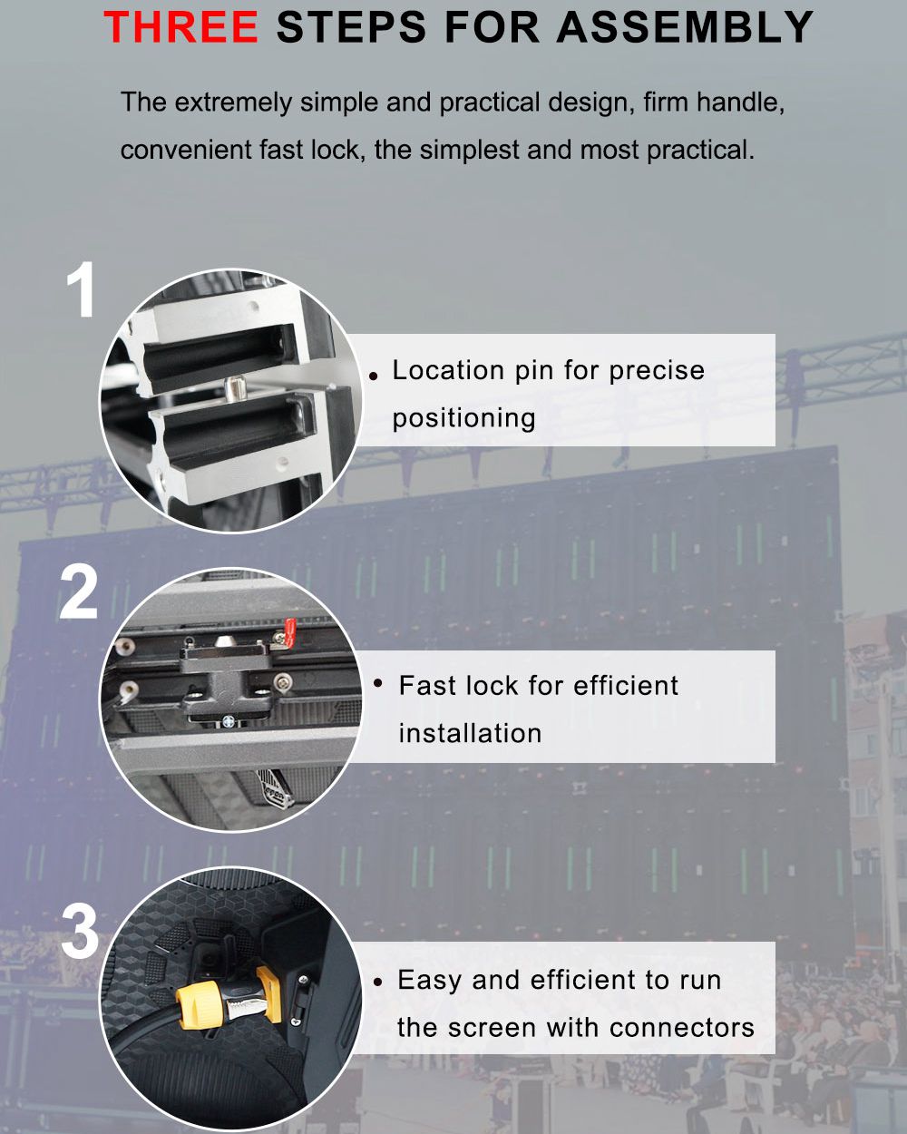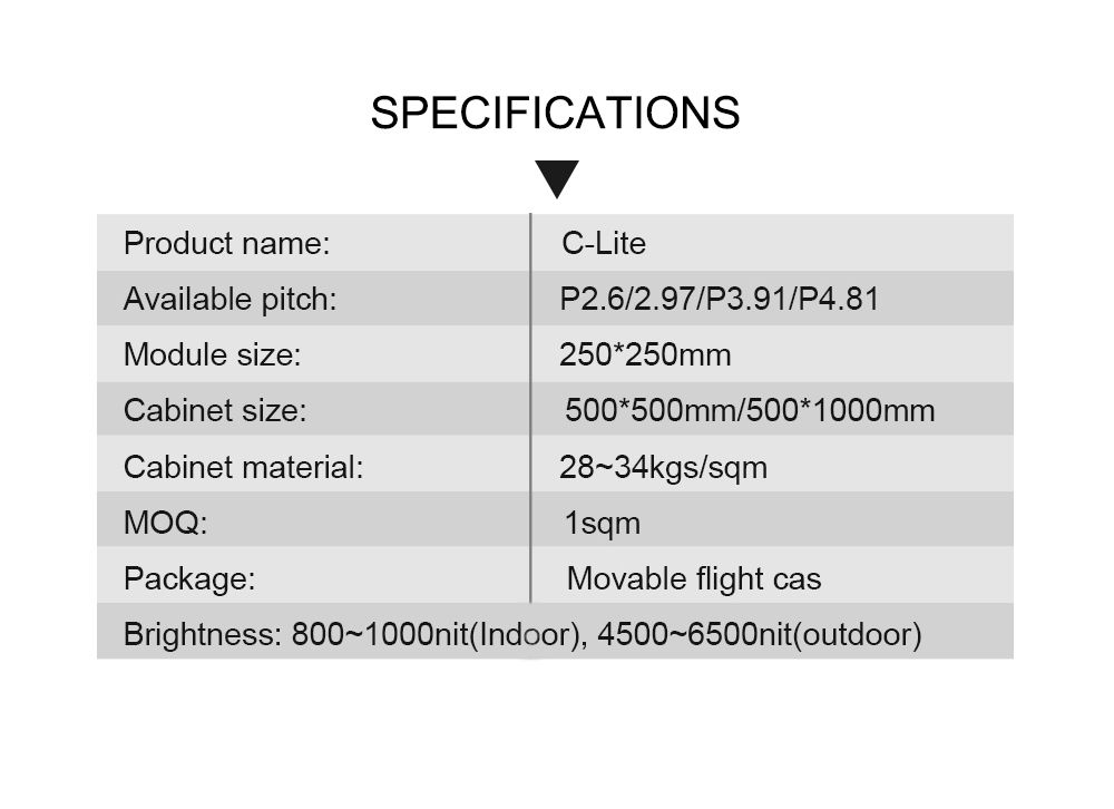C-Lite-D é uma tela LED de aluguel de última geração para diversas atividades, sua caixa de controle pode ser clicada por travas e almofada de proteção evitando danos às lâmpadas nos cantos, proporcionando melhor experiência na instalação e desmontagem. Características 1. Passo disponível: P2.6,P2.97,P3.91,P4.81 interno/externo 2. Tamanho do gabinete: 500*500mm/500*1000mm 3. Brilho: 800 ~ 1000nit (interno), 4500 ~ 6500nit (externo). 4. Fonte de alimentação integrada e cartão receptor. Conecte e desconecte em 1 segundo. 5. Travas rápidas de cima para baixo, esquerda e direita, 2 segundos para conectar gabinetes. 6. Alumínio fundido, alta resistência, alta tenacidade, alta precisão, planicidade ultra-alta, erro de planicidade de tela inteira ≤ 0,01 mm. 7. Design anticolisão na parte inferior do gabinete, posicionando contas na lateral para alinhamento preciso. 8. Bom design de dissipação de calor, sem necessidade de ventilador e ar condicionado, menos ruído durante o trabalho. 9. Alta proteção, resistência à corrosão contra intempéries e névoa salina. 10. Uma variedade de métodos de instalação, podem ser levantados, fixos e empilhados.