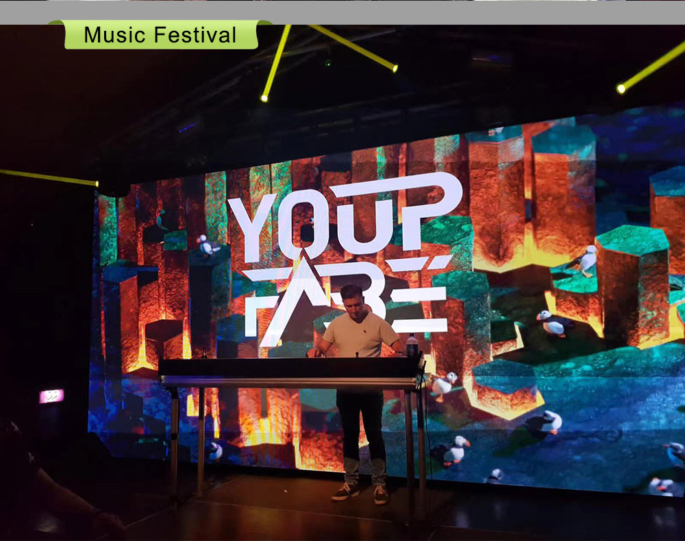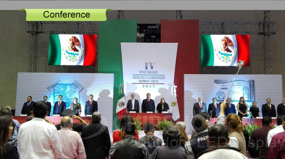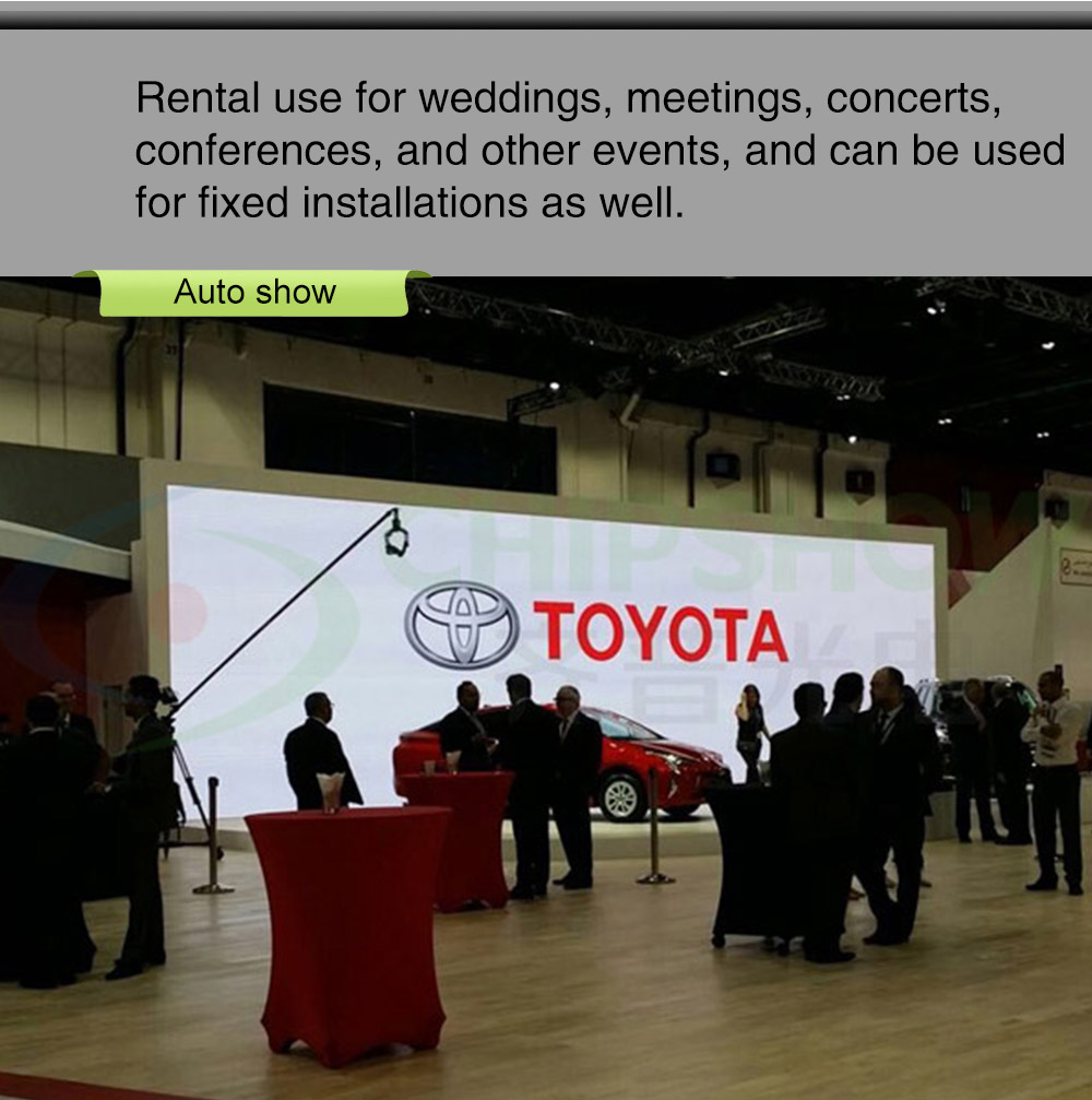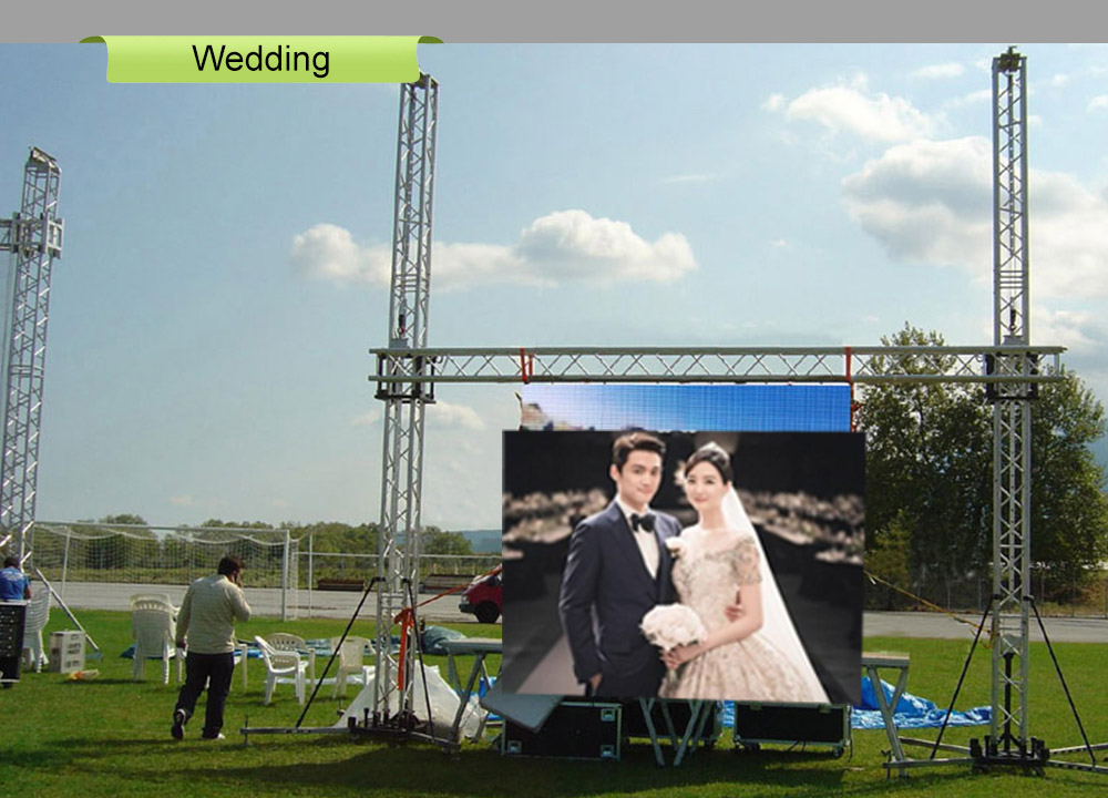 Telas de aluguel para casamentos, conferências, shows, eventos de lançamento e todos os tipos de atividades; também podem ser usadas como soluções de exibição móvel e soluções de exibição permanente, como telas de LED para reboques móveis e telas de exibição de perímetro de estádio.