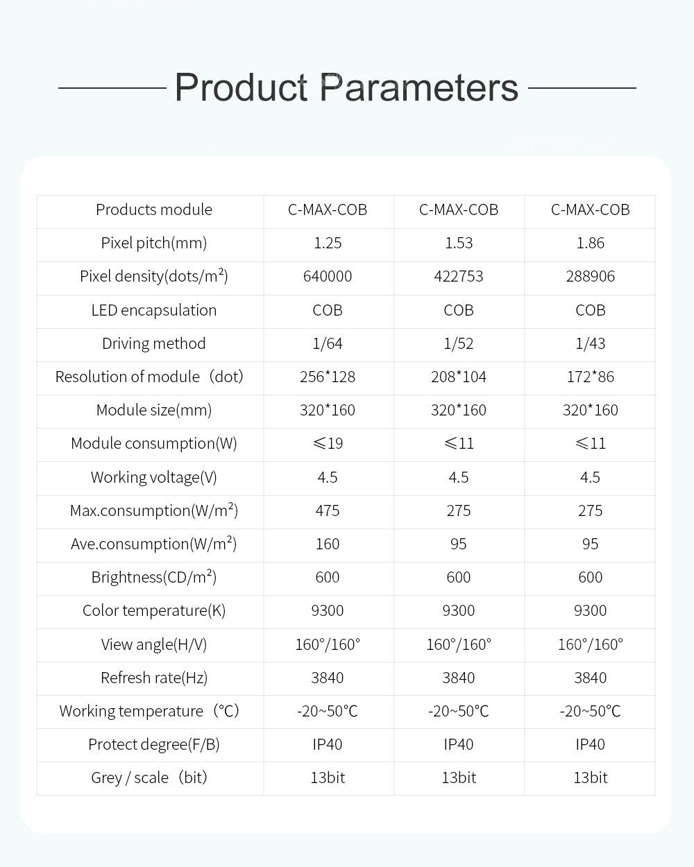 3 Boa compatibilidade: os passos de pixel da série C-Max COB estão disponíveis em 1,25 mm, 1,53 mm e 1,86 mm; os gabinetes podem ser compatíveis com nossos módulos da série C-Max (P1.2/1.3/1.5/1.6/1.8/2/2.5/3/3.3/4); então, quando se trata de atualização de solução para imagens de maior qualidade, você pode economizar um custo considerável em gabinetes;