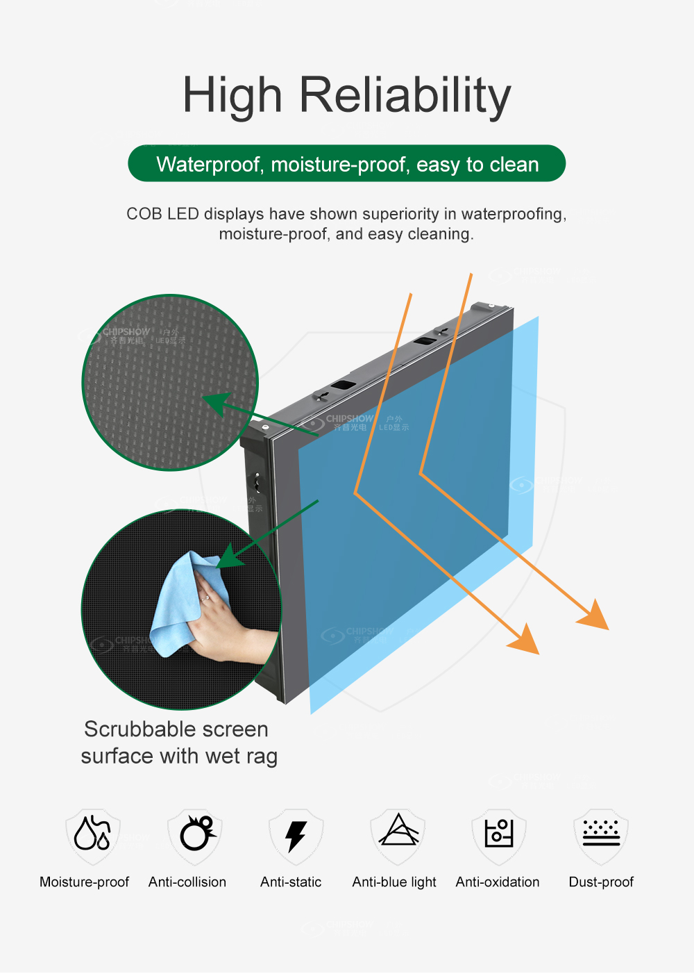 1 Alta confiabilidade: as telas de LED da série C-Max COB são à prova d'água, à prova de umidade e fáceis de limpar;