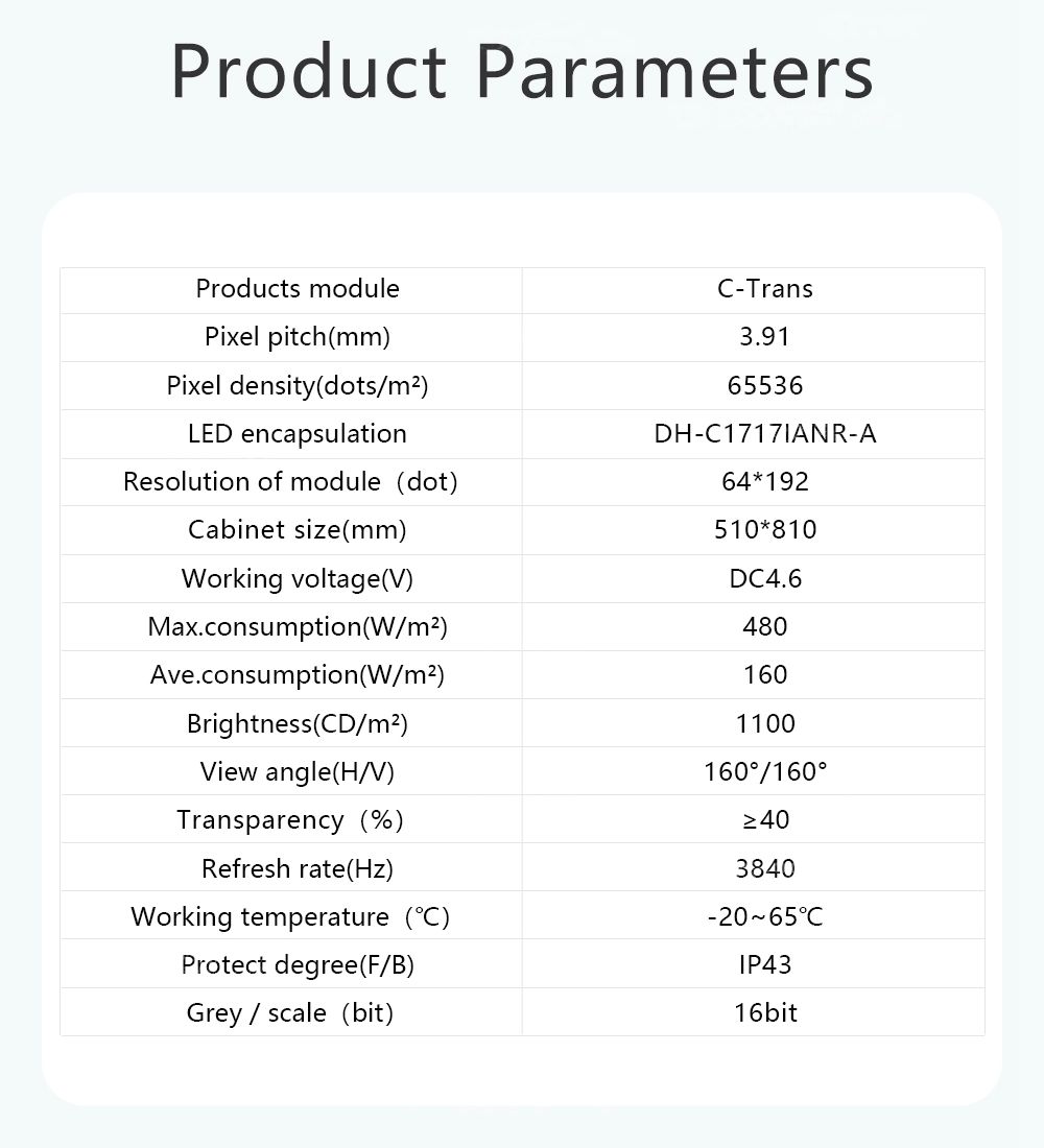 Características: 1 Transferência contínua a partir do ponto de ruptura: a série C-Film quebrou o padrão de design convencional do filme LED transparente - mesmo que um único ponto de falha seja atingido durante a transferência do sinal, isso não afeta a exibição de outras partes (a data do backup é iniciada automaticamente, alternando perfeitamente sem impactar os efeitos de exibição de outros pontos); em outras palavras, a série C-Film possui a função de continuação de ponto de interrupção que proporciona um desempenho mais estável; 2 Alta transparência: a transparência do filme LED é superior a 78%, não afeta a iluminação natural dos vidros; 3 Alta escala de cinza: o canal RGB adota a regulação linear (nível de corrente de 32 níveis) para exibir a imagem em escala de cinza de 16 bits sob qualquer corrente; portanto, você não precisa se preocupar com a exigência de entrada de corrente, seja em circunstâncias internas ou semi-externas; 4 Instalação simples: não há necessidade de suporte de estrutura de aço, basta colar o filme nos vidros, e ele pode começar a ser exibido após a conexão do sinal de alimentação; 5 Leve e fino: o filme é tão fino quanto 2,5 mm e o gabinete é tão leve quanto 5KG; 6 Retardador de chama e anti-ultravioleta: o grau retardador de chama do filme atinge V-1, e o filme pode resistir ao ultravioleta por mais de 8 anos sem amarelar; 7 Ampla aplicação: o telão LED filme é muito comum em estabelecimentos comerciais internos, e é amplamente utilizado para publicidade em meios transparentes, como paredes de cortina de vidro, paredes de acrílico, guarda-corpos de vidro…