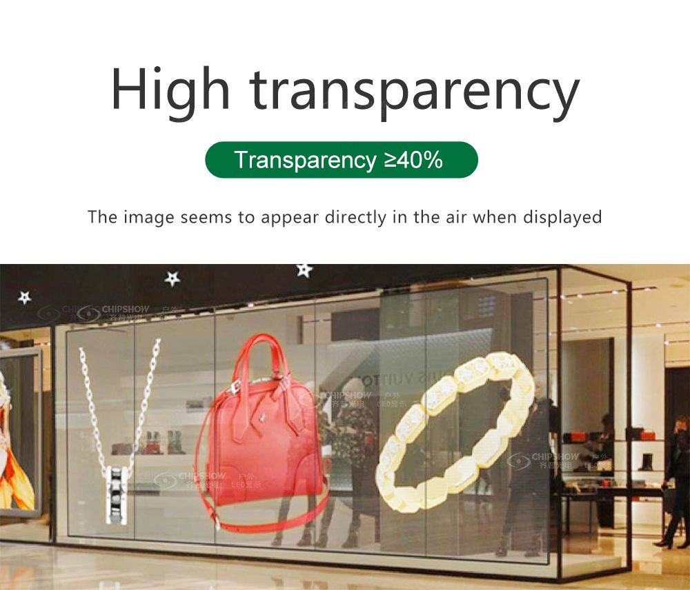 2: Alta transparência: a taxa de transparência chega a mais de 40%; quando a tela está sendo exibida, as imagens parecem estar aparecendo no ar;