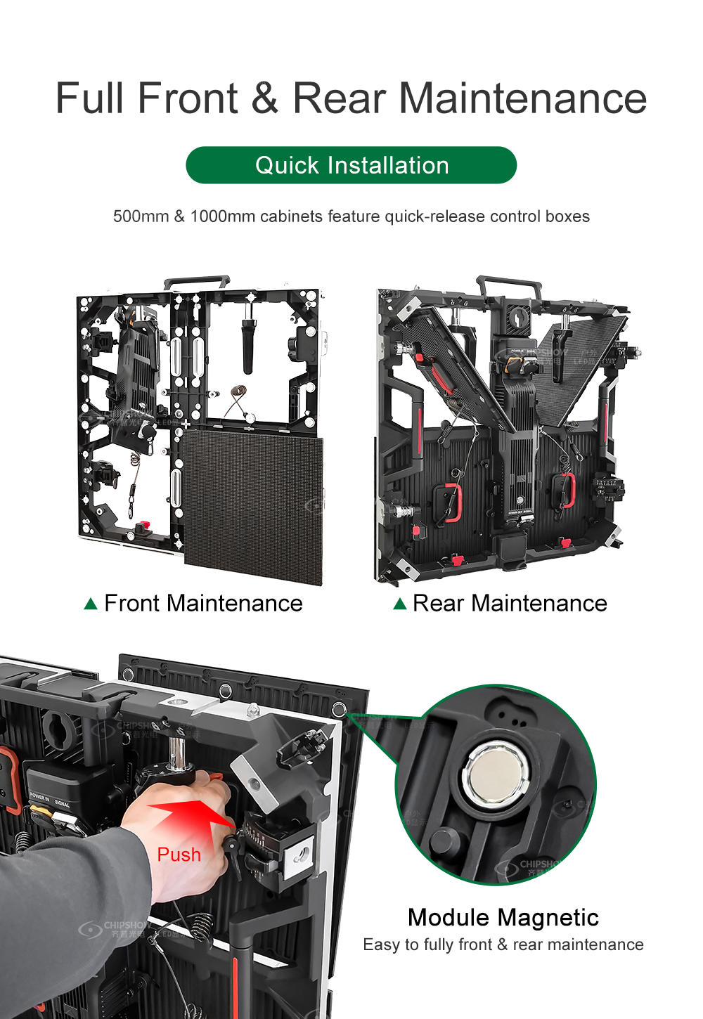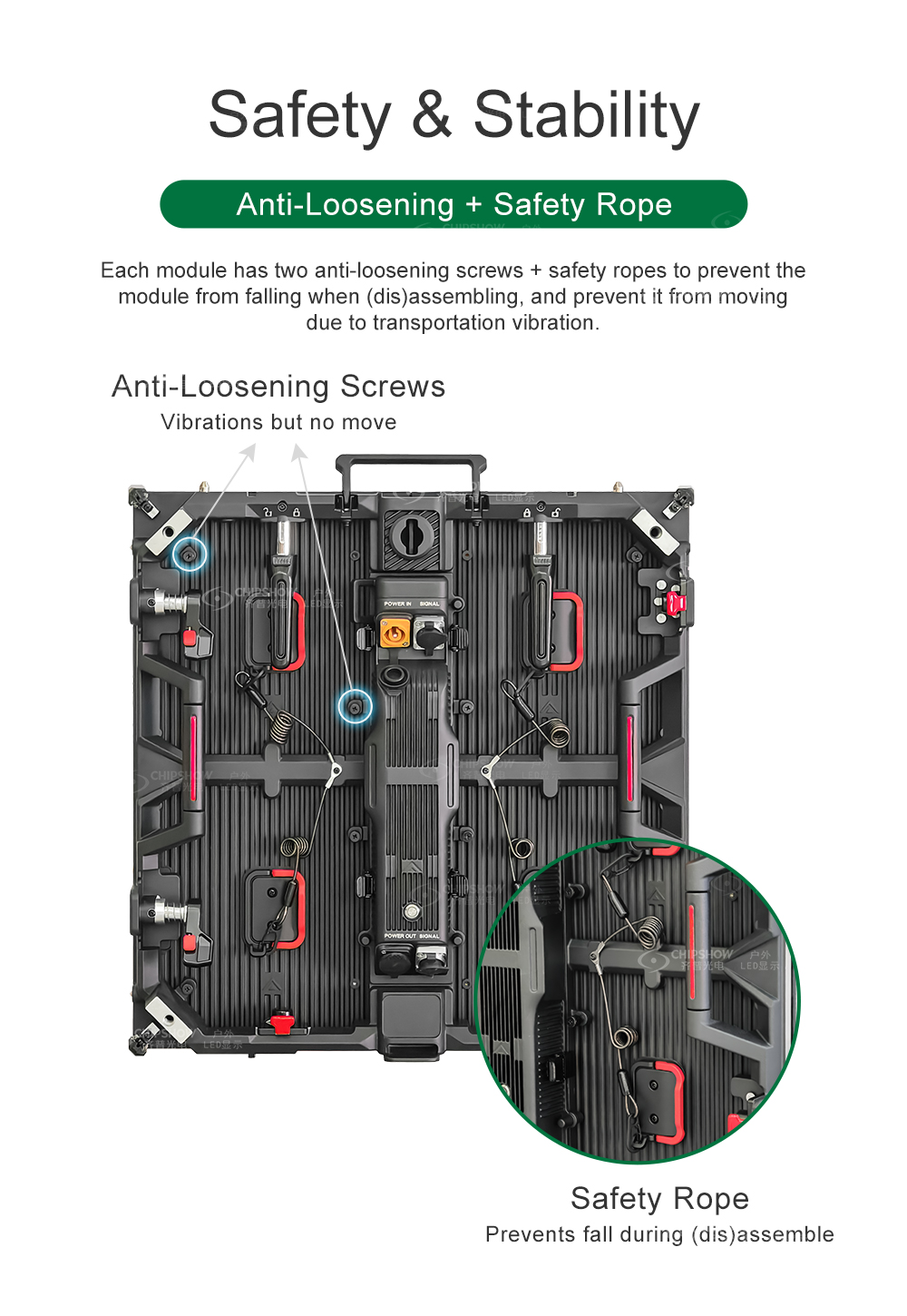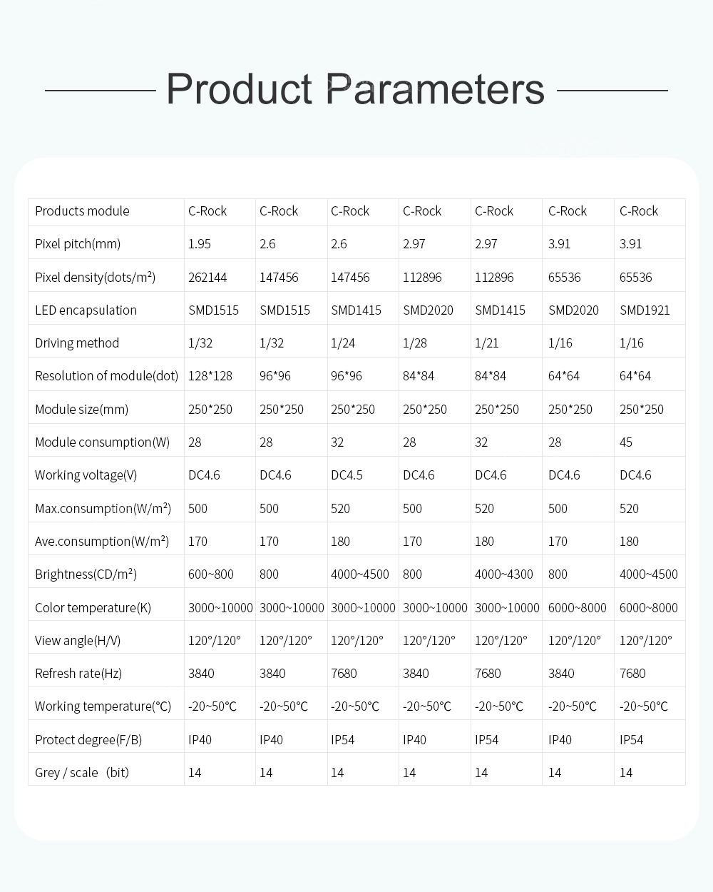 10 Aplicável para uso interno e externo: como uma solução abrangente de display LED para apresentações em palco, conferências e eventos, a série C-Rock para uso interno está disponível em passos de pixel de 1,95 mm, 2,604 mm e 3,91 mm; e a série C-Rock para uso externo está disponível em passos de pixel de 2,604 mm, 2,97 mm, 3,9 mm e 4,8 mm;