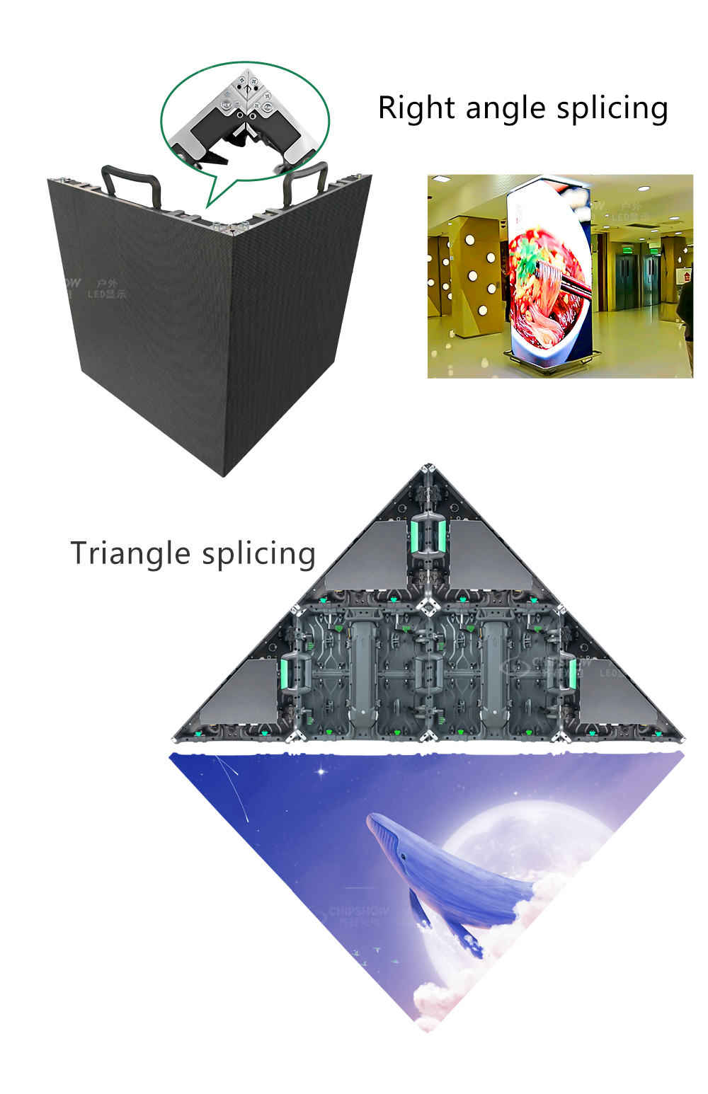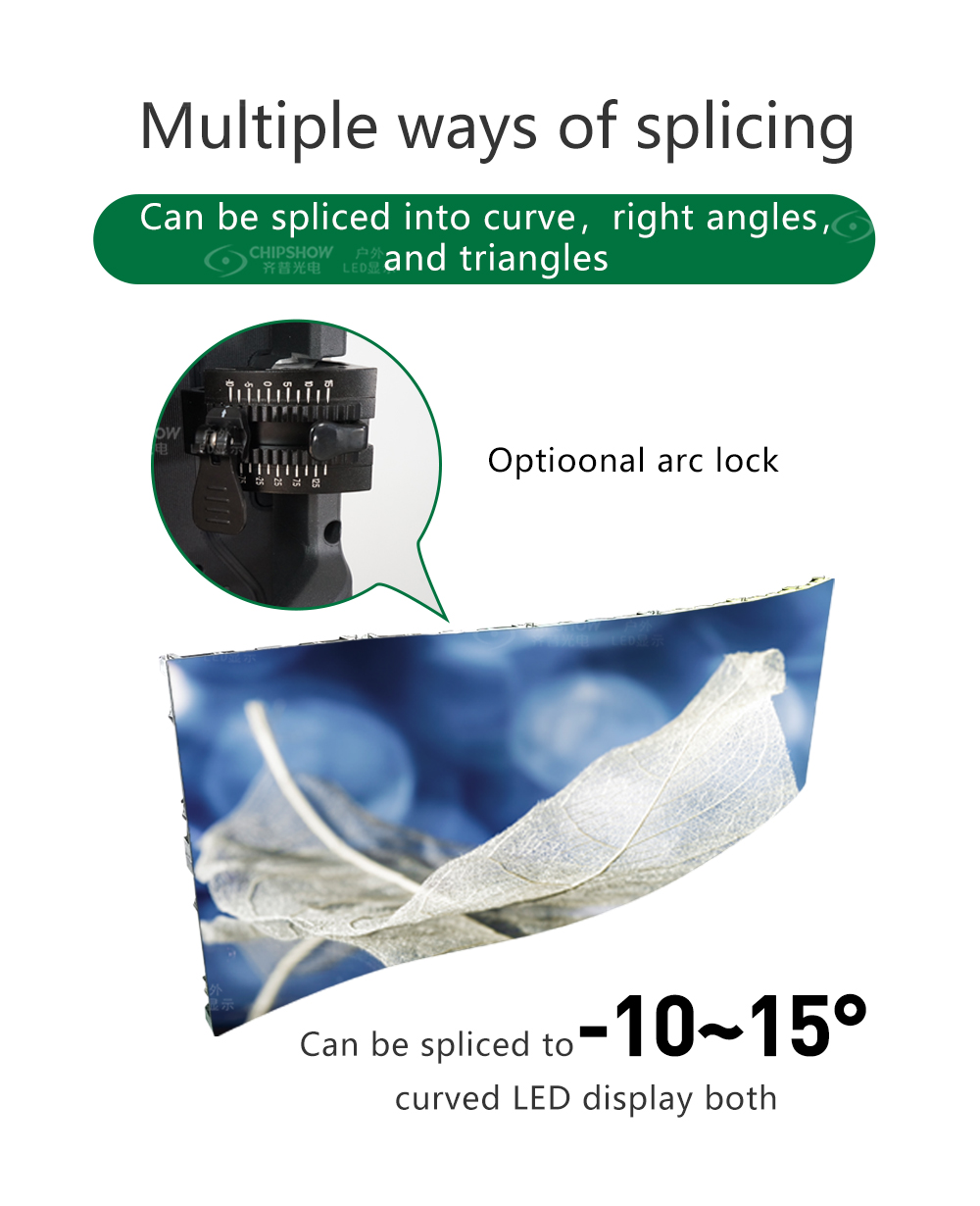 4. Trava curva opcional, capaz de emendar telas grandes com curvatura de 10 ° ~ 15 °, canto de 90 °, etc;