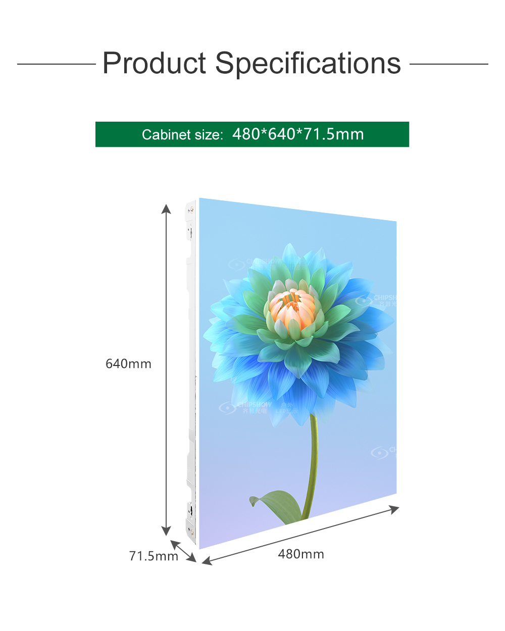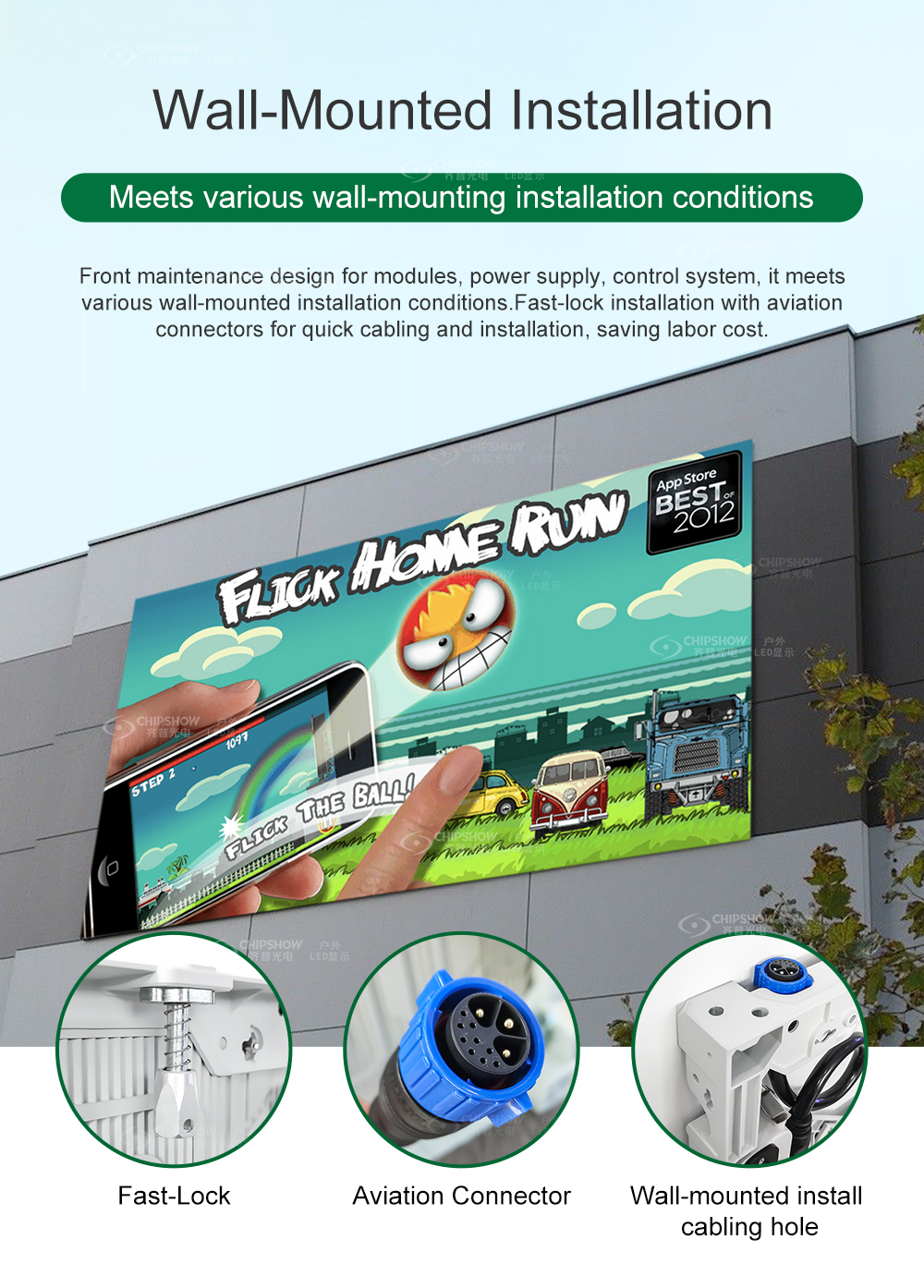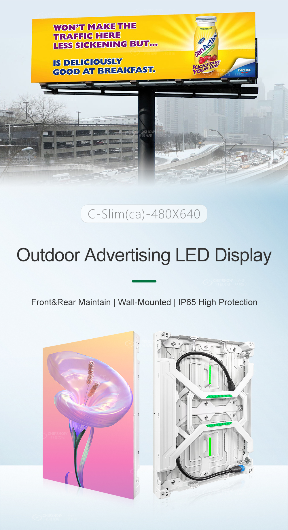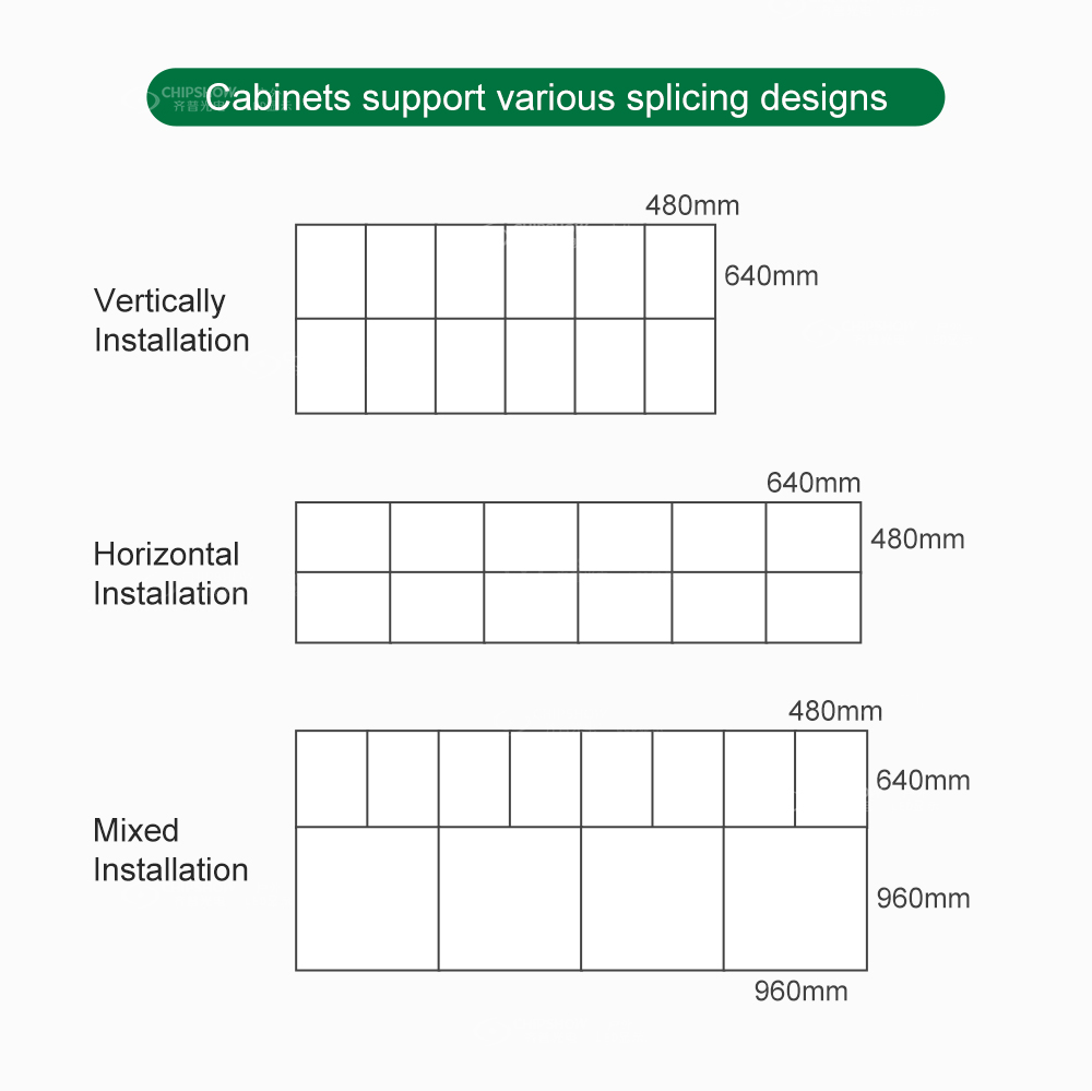 Montagem flexível: o tamanho pequeno da unidade (480 mm * 640 mm) oferece conveniência para usuários na montagem de diferentes tamanhos de placas/sinalizações/outdoors; também suporta emendas com gabinetes C-Slim de tamanho grande (tamanho: 960 mm * 960 mm); por exemplo, uma tela de exibição com proporção de 16:9 pode ser facilmente emendada;