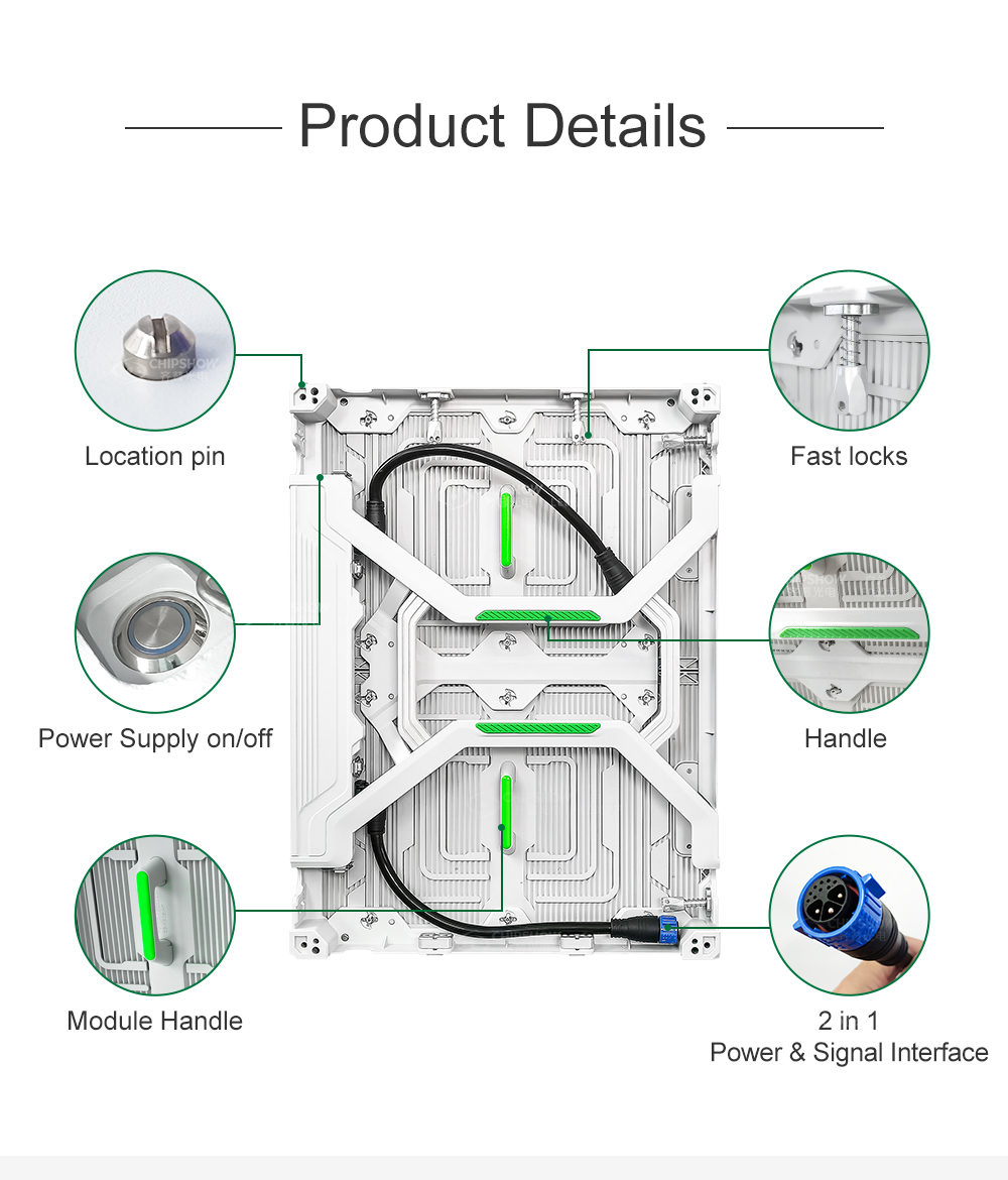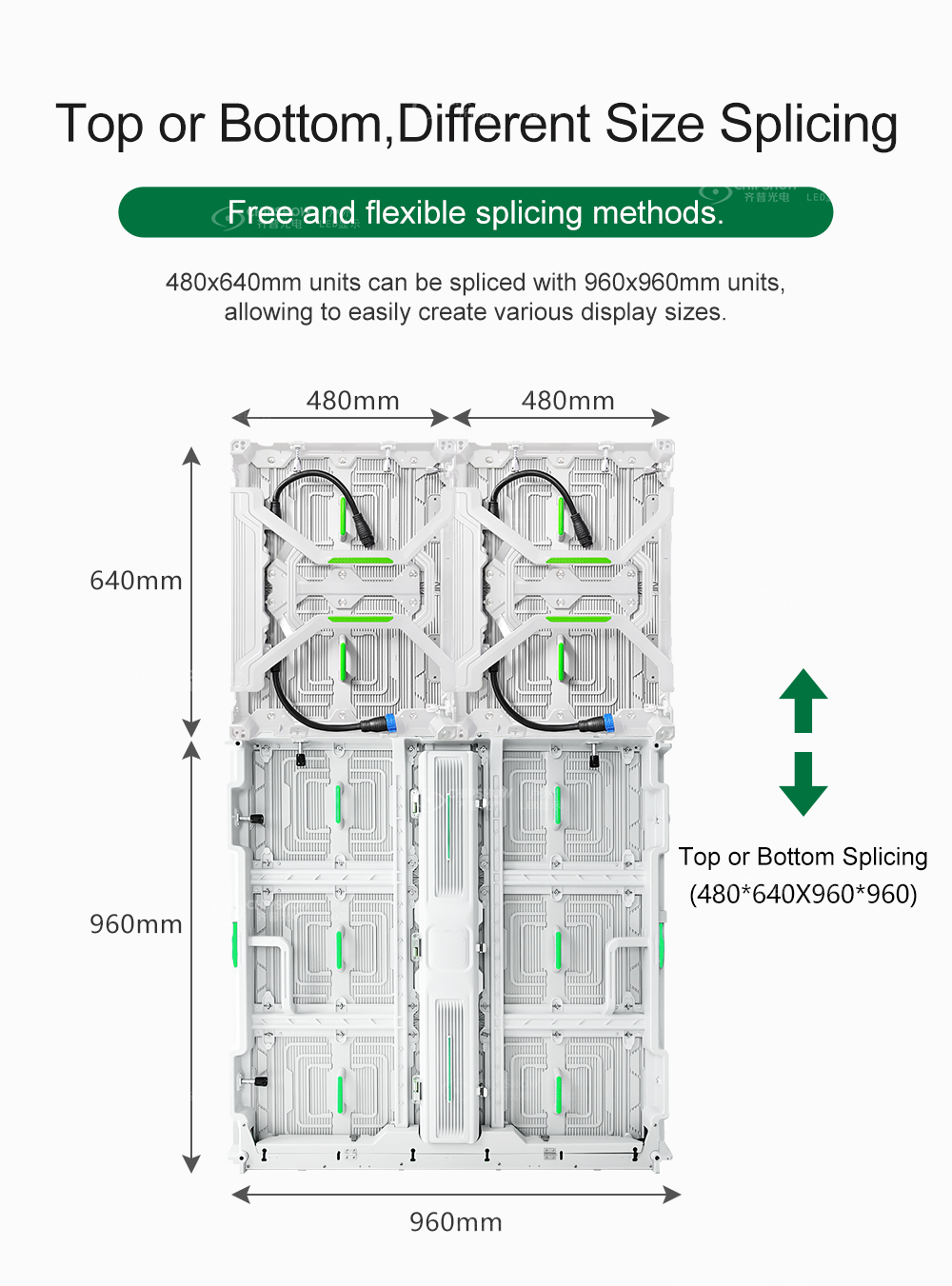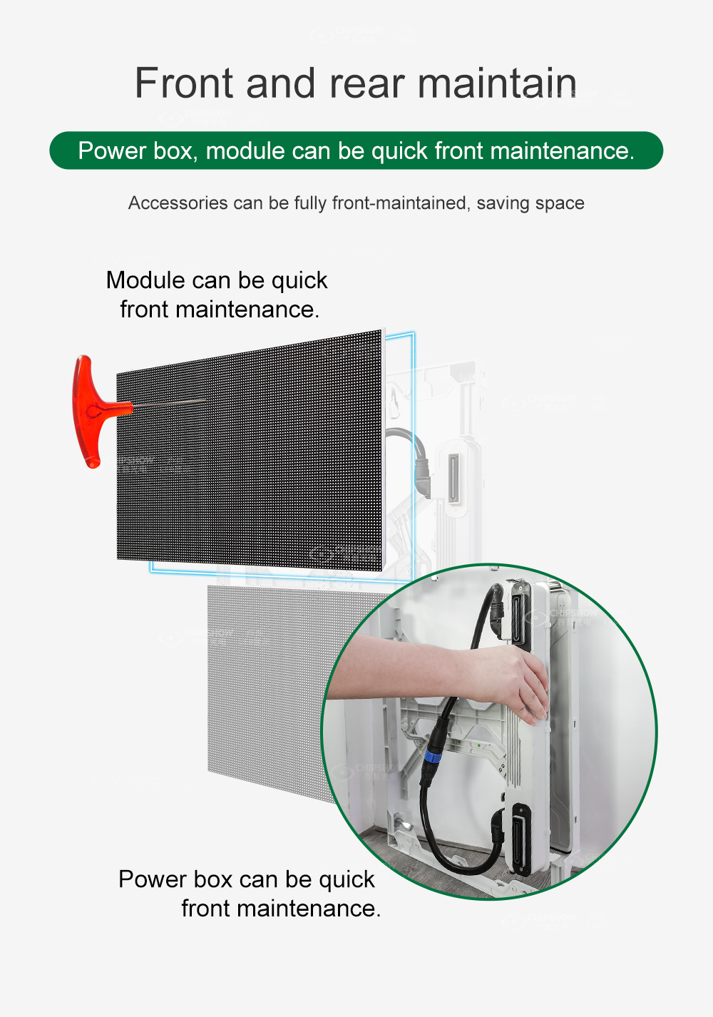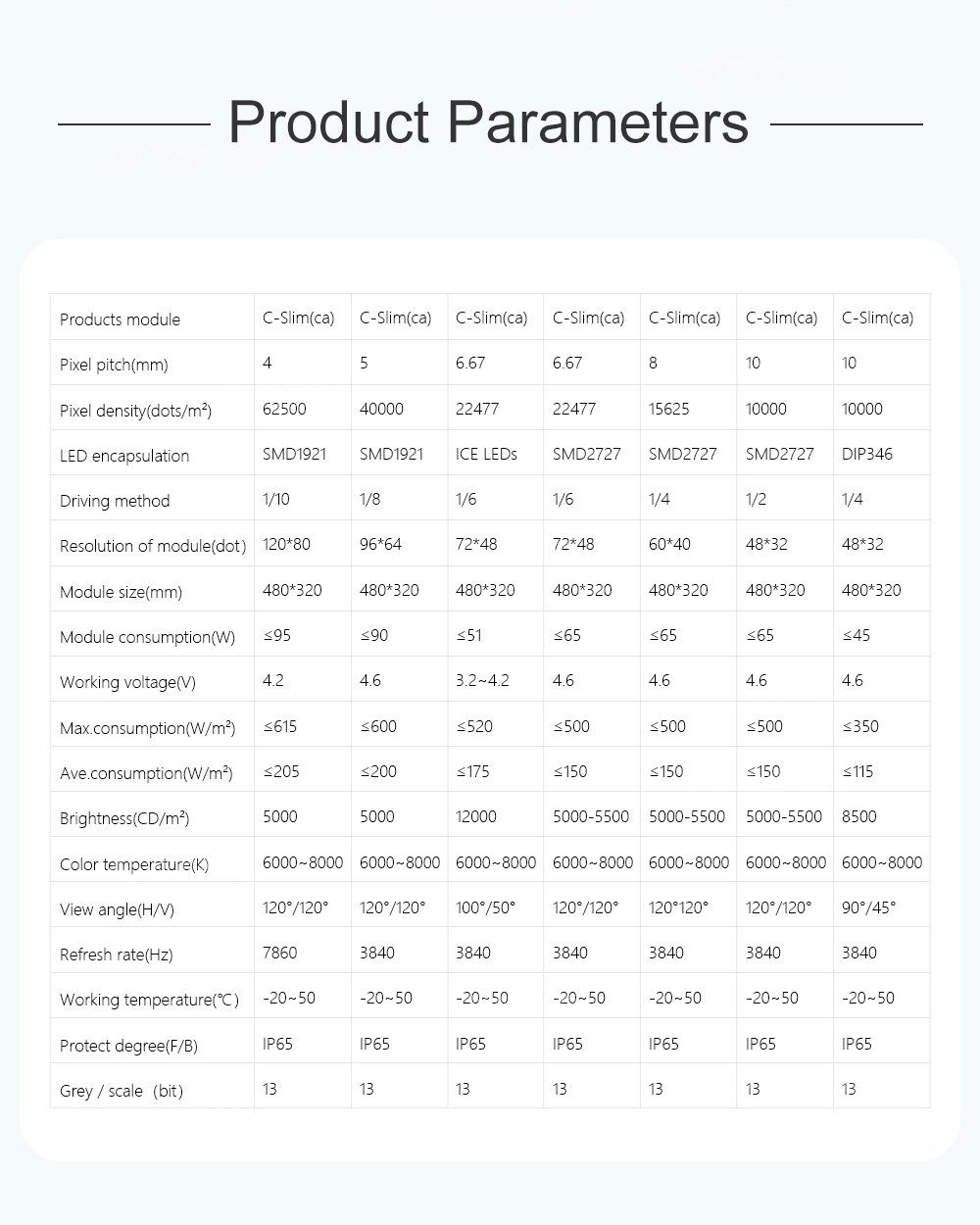 Montagem flexível: o tamanho pequeno da unidade (480 mm * 640 mm) oferece conveniência para usuários na montagem de diferentes tamanhos de placas/sinalizações/outdoors; também suporta emendas com gabinetes C-Slim de tamanho grande (tamanho: 960 mm * 960 mm); por exemplo, uma tela de exibição com proporção de 16:9 pode ser facilmente emendada;
