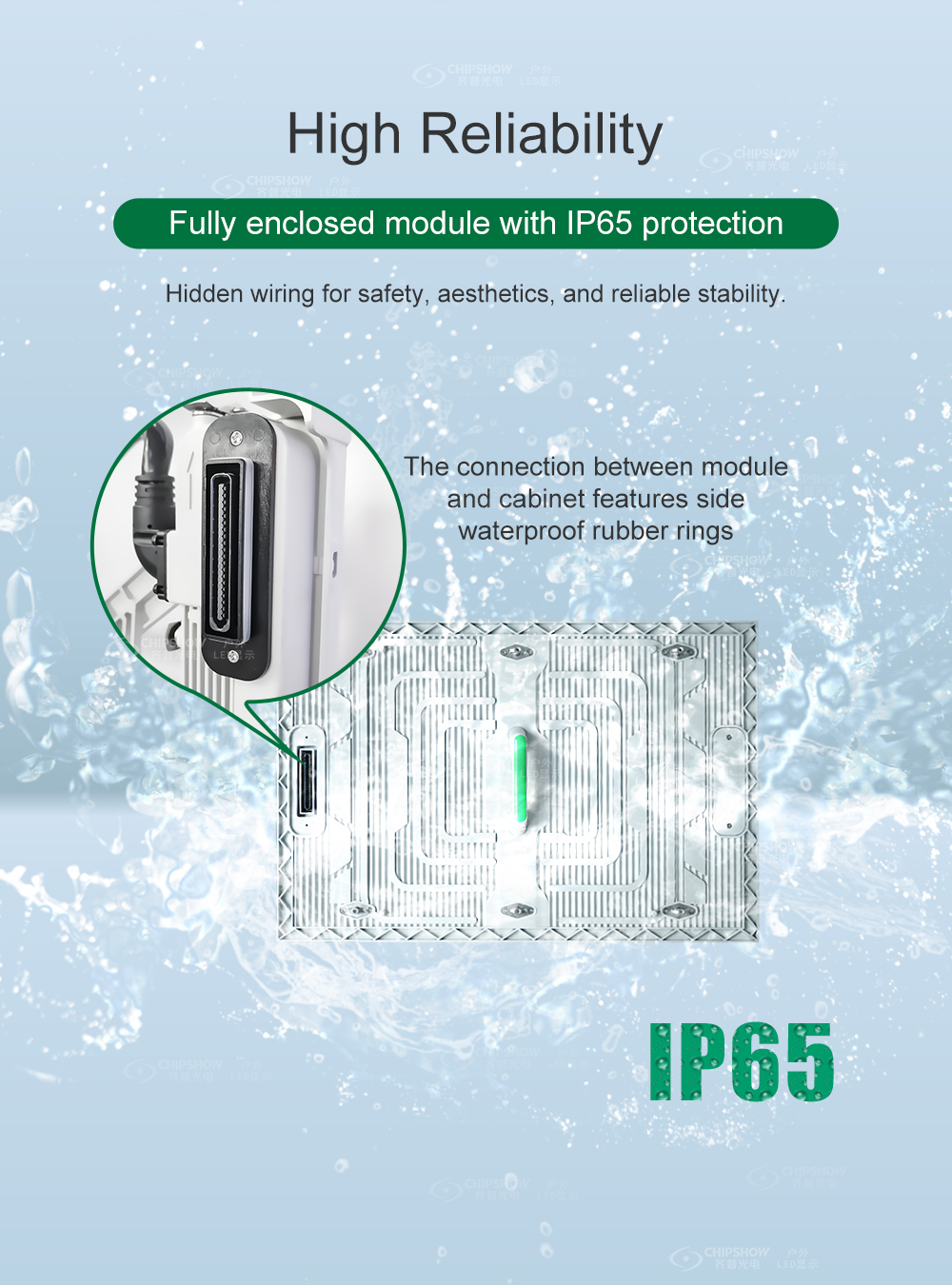 Bom desempenho à prova d'água: a tecnologia de impermeabilização lateral é aplicada entre os gabinetes; os módulos totalmente fechados têm classificação IP-65 de impermeabilidade e são ideais para uso externo;