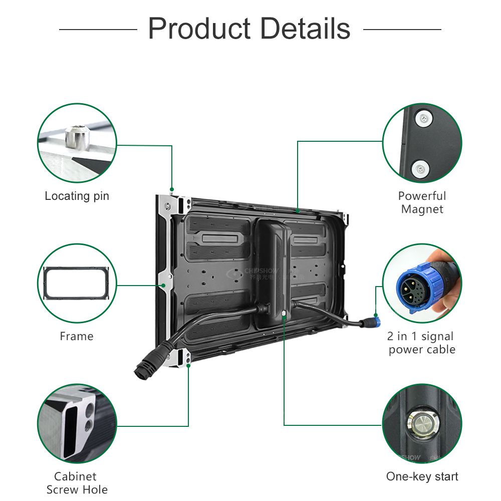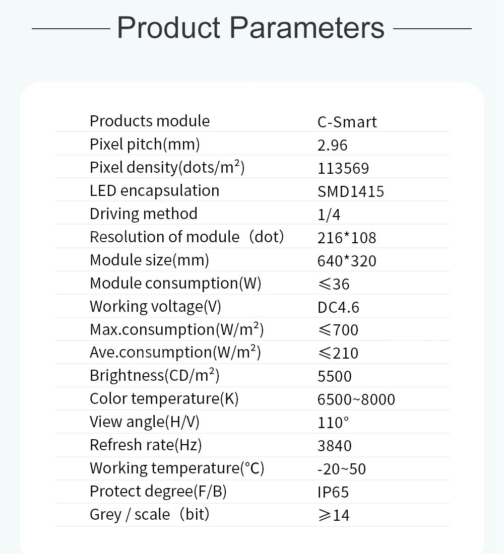 C-Smart é uma tela LED frontal e traseira simples e integrada que pode ser reparada. Sem design de gabinete, basta uma moldura simples para segurar os módulos, o que pode reduzir um grande custo de instalação. Vantagens: 1. Integração do módulo e gabinete, substituindo o gabinete tradicional e com economia de custos. 2. Design ultrafino, instalação na parede, manutenção mais fácil na frente e atrás. 3. Design de máscara exclusivo, cor escura, alto contraste. 4. Tamanho do módulo 640 mm * 320 mm, tamanho maior, melhor planicidade. 5. Unidade de corrente constante, varredura 1/10. 6. Alto brilho de até 5500cd/㎡ e tem as vantagens de boa curva de distribuição de luz e boa consistência de ângulo. 7. Grau à prova d'água IP65 do módulo.