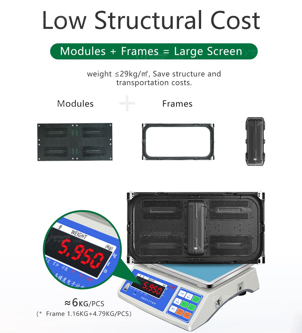 1 Baixo custo estrutural: os módulos necessitam apenas de um simples suporte para formar uma grande tela de LED; o peso do módulo é inferior a 29 kg/ã¡; isso pode ajudá-lo a economizar custos de transporte e estruturas de suporte de carga;