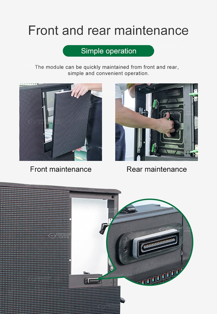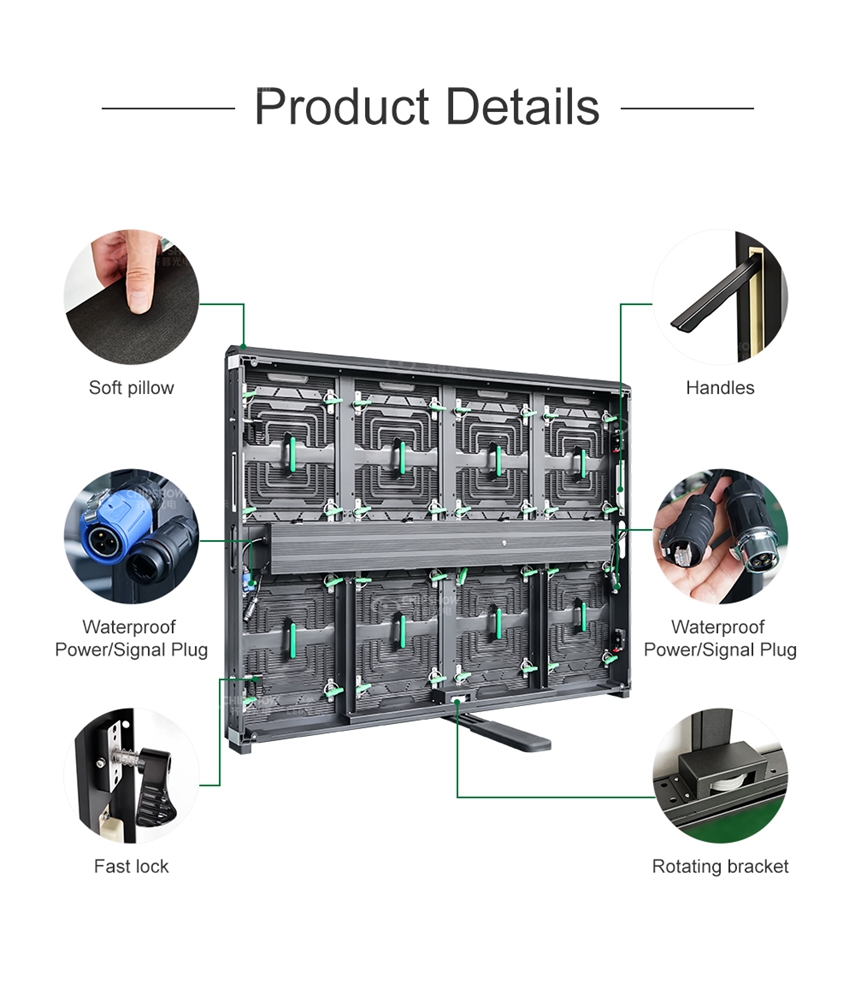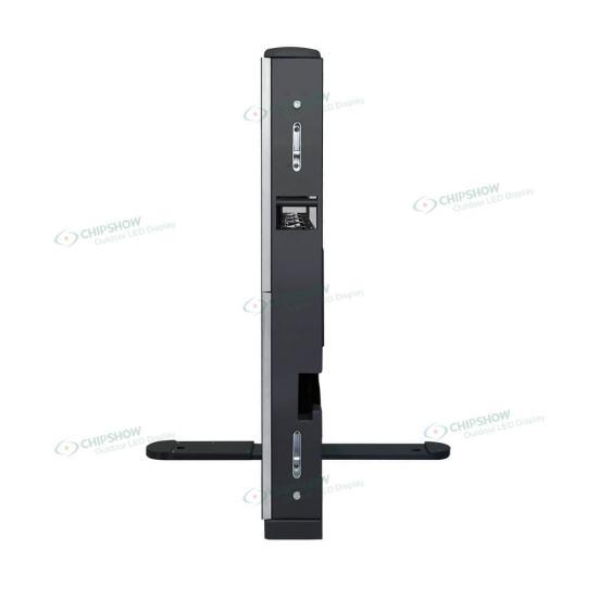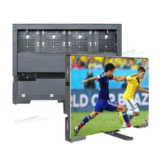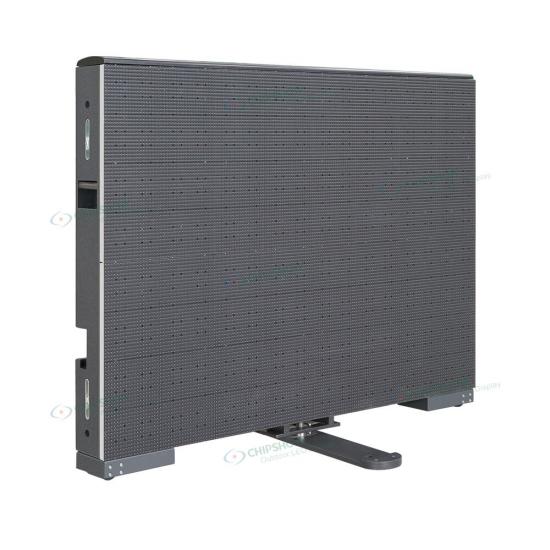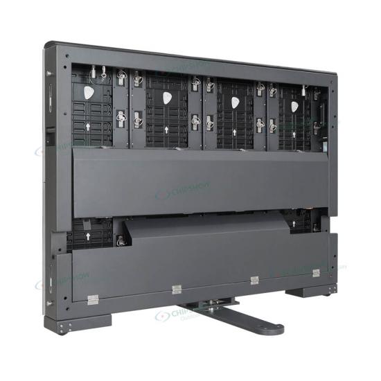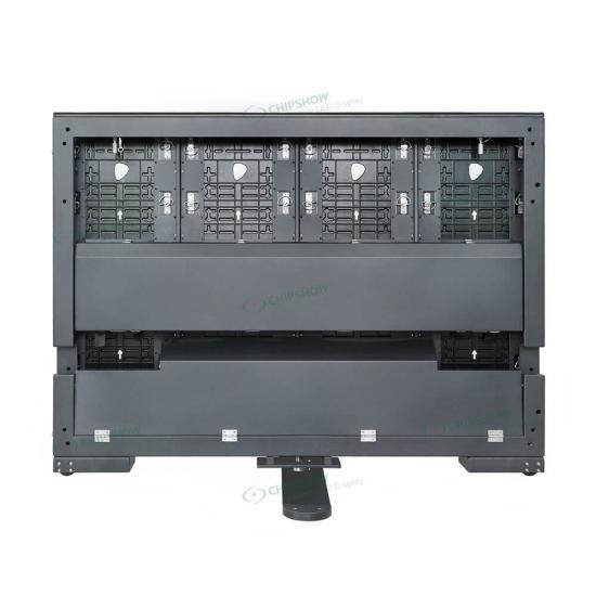 ◙ O gabinete vem com um suporte giratório de 90° e travas rápidas esquerda e direita para montagem eficiente do telão LED do estádio.