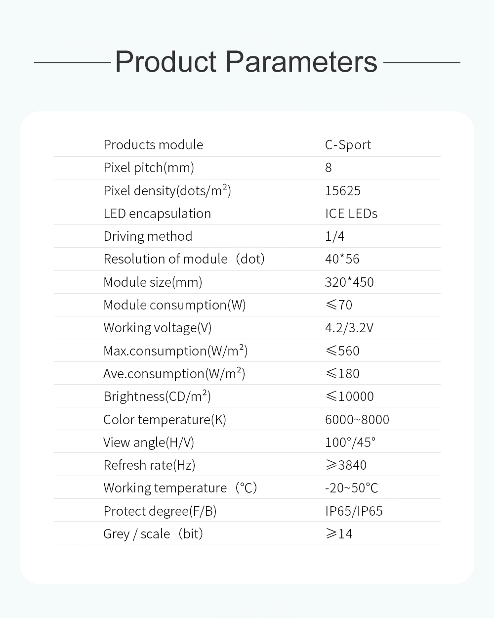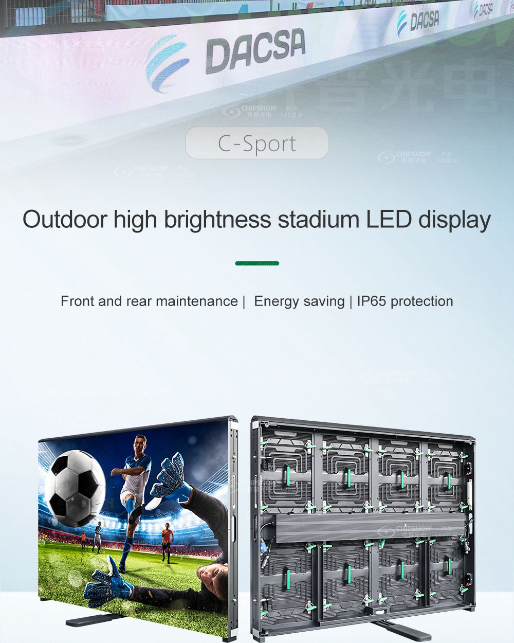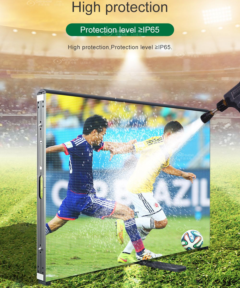 ◙ O gabinete vem com um suporte giratório de 90° e travas rápidas esquerda e direita para montagem eficiente do telão LED do estádio. ◙ A tela vem com máscara macia e proteção de travesseiro, para que os atletas e o display LED fiquem perfeitamente protegidos. ◙ Caixa de alimentação de alumínio, fina e leve, boa dissipação de calor, retardando o envelhecimento da potência e do módulo. ◙ Manutenção frontal e traseira do módulo, fácil operação. ◙ À prova d'água e à prova de poeira, grau de proteção ≥ IP65. ◙ Economia de energia, cerca de 1/3 de economia de energia do que o display LED tradicional, reduzindo bastante o custo operacional. ◙ Software profissional e suporta entrada de fonte de vídeo como DP, HDMD, VGA, SDL, DVD, etc.