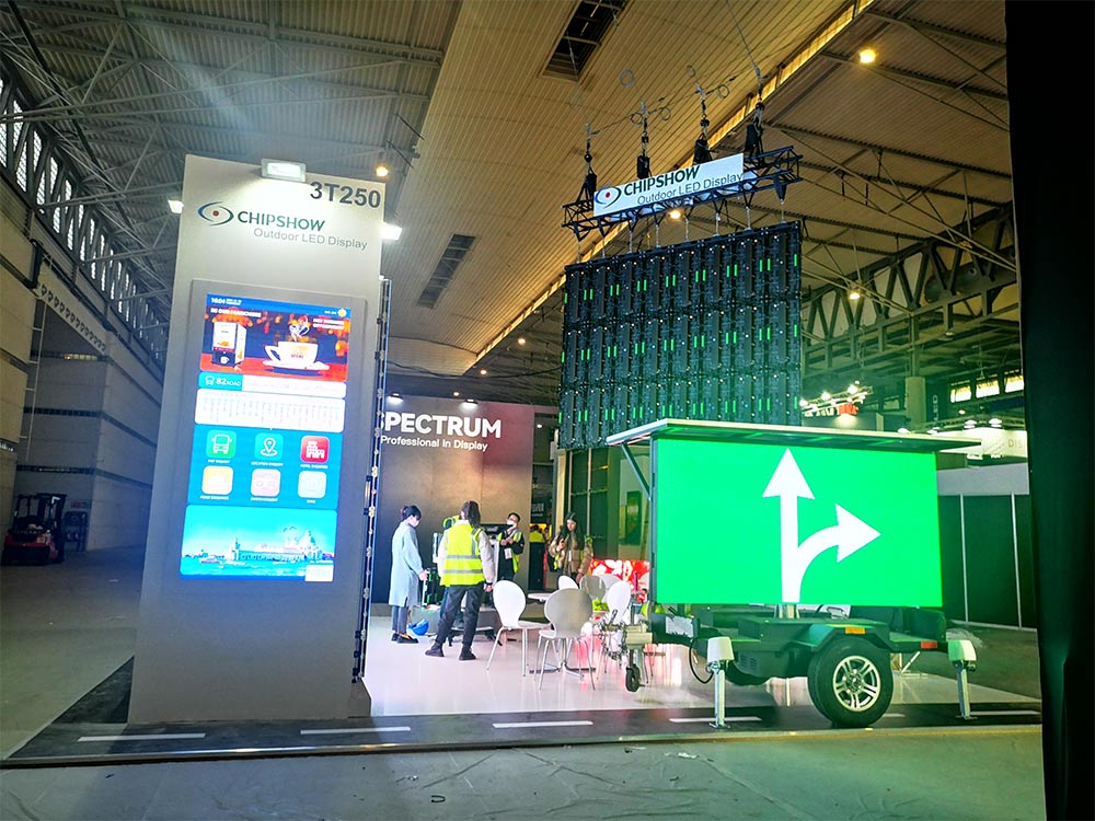 A série de displays LED de pesquisa e inovação da Chipshow é a série Chipshow Traffic LED. Possui uma ampla categoria de produtos, entre eles o primeiro tipo a ser destacado no ISE 2023 é C-Tra-VMS-C P8 Solar LED Sign . Este display apresenta um design dobrável exclusivo, tamanho dobrável 572*160*752mm, consumo de energia muito baixo ≤ 40W/ ㎡ , sistema de gerenciamento de exibição exclusivo capaz de atualizar o conteúdo de aviso via telefone celular, disco flash USB ou WiFi. Sistema de carregamento solar com armazenamento de bateria, todos os materiais de proteção contra intempéries usados no interior, também equipado com rodas na parte inferior para que este pacote de exibição seja uma solução completa para sistema de controle de tráfego para qualquer lugar, posição ou hora.