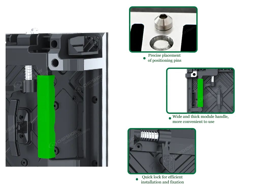 Design magnético : O módulo de sucção magnética do C-Lite-Plus P1.56 pode ser mantido na frente e atrás, e a sucção magnética entre os gabinetes é posicionada e instalada com precisão, tornando a instalação de aluguel mais econômica e eficiente.