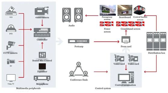 A solução inclui telas de LED e seus equipamentos de sistema auxiliar periférico, software e hardware. Através da integração orgânica de software e hardware, a interconexão e o controle colaborativo são alcançados, atendendo ao controle centralizado e ao controle de ligação de múltiplas cenas, múltiplas telas, múltiplos dispositivos, múltiplos sistemas e múltiplos sinais, atendendo às necessidades de operações comerciais simplificadas e flexíveis, e ajudar na informatização de eventos esportivos e na construção inteligente de instalações esportivas.